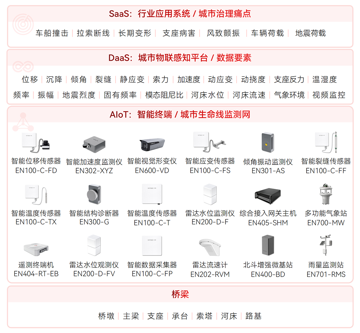 讀懂橋梁“健康信號”:五大垮塌征兆的實時監測方案WITBEE?萬賓科技?橋梁結構健康監測系統可實時識別位移、傾斜、裂縫、索力異常與撓度失衡等五大垮塌征兆,以微米級精度守護橋梁安全運行。